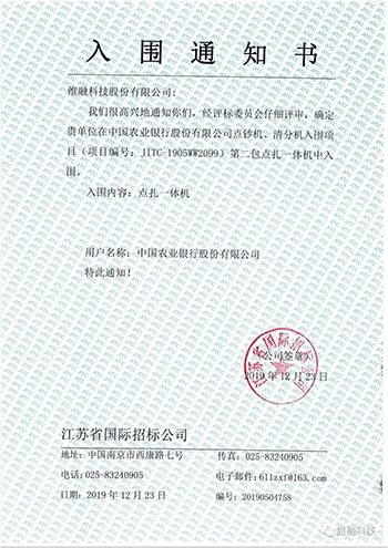 近日,維融科技股份有限公司收到江蘇省國(guó)際招標(biāo)公司發(fā)出的《中國(guó)農(nóng)行股份有限公司點(diǎn)鈔機(jī)、清分機(jī)入圍通知書(shū)》(項(xiàng)目編號(hào):JITC-1905WW2099),確定維融科技中標(biāo),中標(biāo)產(chǎn)品包括:人民幣點(diǎn)鈔機(jī)、點(diǎn)扎一體機(jī)。 維...