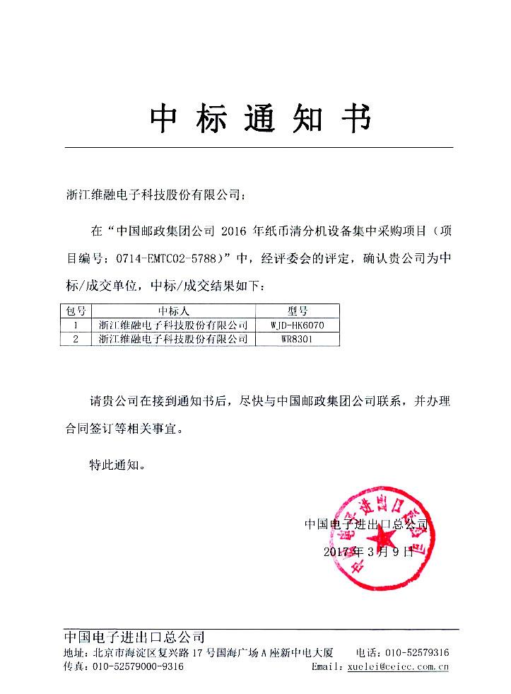 近日,我公司收到中國電子進出口總公司發(fā)出的《中標通知書》。在中國郵政集團公司2016年紙幣清分機設備集中采購項目(項目編號:0714-EMTC02-5788)中,經(jīng)評標委員會的評定,確認維融科技股份有限公司為中標單位,入圍產(chǎn)品為1+1口紙幣清分機、2+1口紙幣清分機。