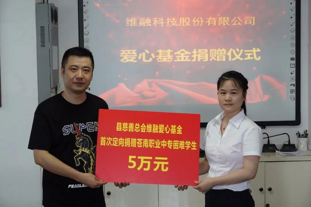 5月中旬,維融科技與蒼南縣職業中等專業學校簽訂《校企合作協議書》,雙方達成以產教融合模式,實現人才培養適應維融科技發展需求。6月,經蒼南縣維融愛心基金理事會商議、請示,縣慈善總會同意,將縣職業中等專業學校全體學生納入“蒼南縣維融愛心基金”幫扶范圍內。